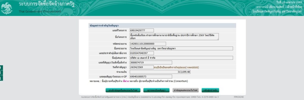 ประกาศข้อมูลสาระสำคัญในสัญญา งานซื้อหนังสือเรียน ฝ่ายการศึกษานานาชาติขั้นพื้นฐาน ประจำปีการศึกษา ๒๕๖๙ โดยวิธีคัดเลือก