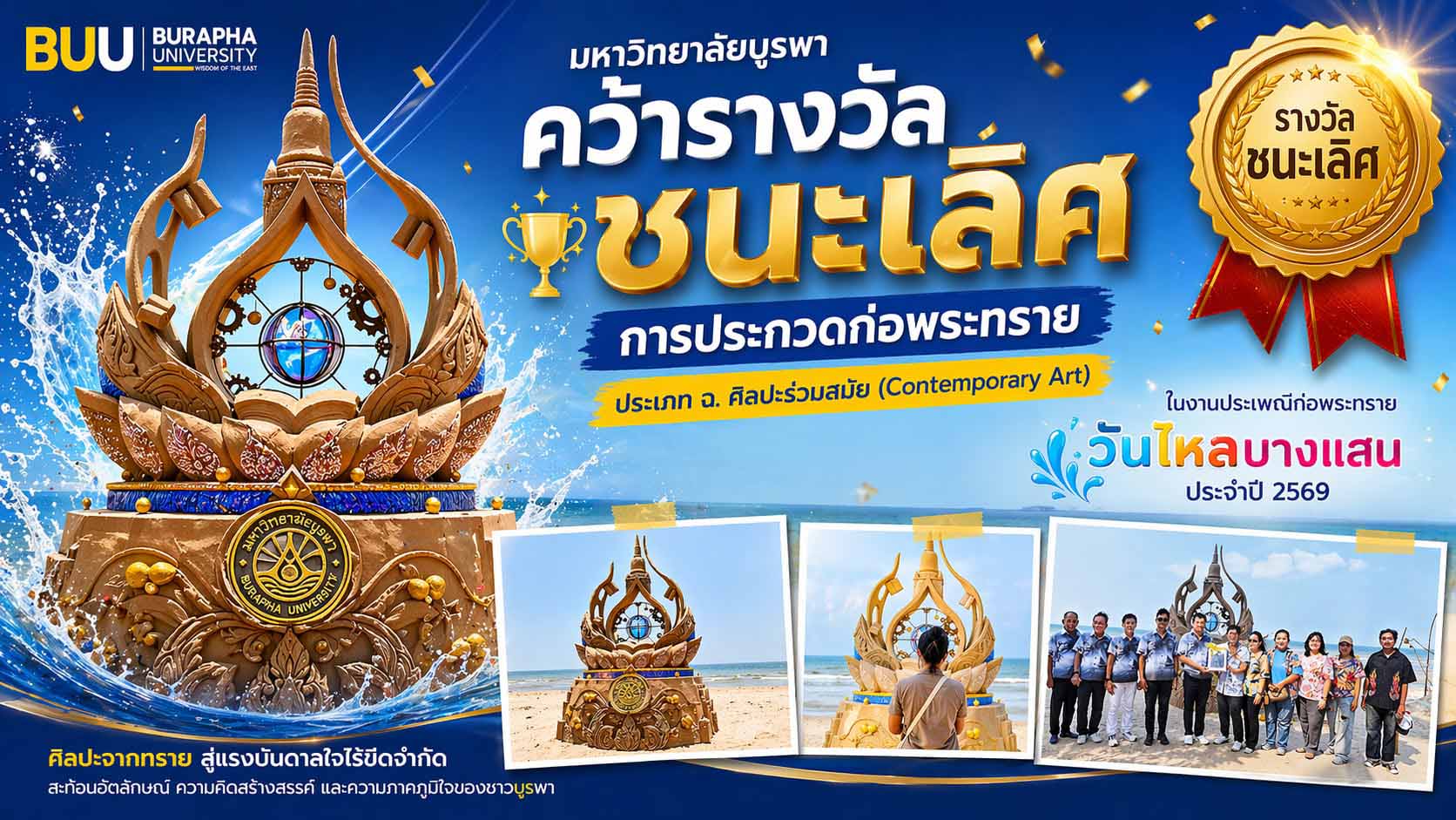 “ทราย” สัญลักษณ์ของความไหลลื่นและไม่จีรัง แต่สำหรับ ชาวบางแสน ทรายคือต้นทุนทางวัฒนธรรมที่ล้ำค่าที่สุดชิ้นหนึ่ง ในงานประเพณีก่อพระทรายวันไหลบางแสน ประจำปี 2569 มหาวิทยาลัยบูรพา ในฐานะสถาบันอุดมศึกษาหลักของภูมิภาค ได้คว้ารางวัลชนะเลิศการประกวดก่อพระทราย ประเภท ฉ. ศิลปะร่วมสมัย (Contemporary Art) ตอกย้ำบทบาทการเป็นผู้นำทางปัญญาที่พร้อมจะขับเคลื่อน “ต้นทุนทางวัฒนธรรม” ให้กลายเป็น “มูลค่าทางสังคม” จารีตแห่งท้องทะเล: พลวัตของทรายและศรัทธา ประเพณีก่อพระทรายวันไหลบางแสน มิได้เกิดขึ้นเพียงเพื่อความรื่นเริง แต่เป็นมรดกทางวัฒนธรรมที่ฝังรากลึกจากพิธี “ทำบุญวันไหล” ของชาวทะเลตะวันออก การนำทรายที่ติดเท้าออกจากวัดมาคืนในรูปแบบของการก่อเจดีย์ เป็นกุศโลบายที่สร้างความสมดุลระหว่างมนุษย์ ธรรมชาติ และศาสนา มหาวิทยาลัยบูรพาได้เล็งเห็นถึงคุณค่าทางวัฒนธรรมในจุดนี้ จึงได้นำกระบวนการคิดเชิงออกแบบ (Design Thinking) มาประยุกต์ใช้เพื่อยกระดับงานประเพณีให้ก้าวข้ามผ่านกาลเวลา การก่อพระทรายจึงเป็นกระบวนการสร้างสรรค์ที่ผสานความรู้ดั้งเดิมเข้ากับแนวคิดการเรียนรู้ในยุคใหม่โดยเปิดพื้นที่ให้นักเรียน นิสิต คณาจารย์ บุคลากร และประชาชนในท้องถิ่น ได้มีส่วนร่วมในการถ่ายทอดและแลกเปลี่ยนคุณค่าทางวัฒนธรรมร่วมกัน อีกทั้ง ยังมีบทบาทในการบ่มเพาะทักษะทางสังคมและการเรียนรู้ร่วมกันระหว่างคนต่างรุ่น ต่างวัย ส่งเสริมการมีส่วนร่วมของชุมชน และยกระดับการใช้วัฒนธรรมเป็นฐานในการพัฒนาเมืองและชุมชนให้มีความเข้มแข็งและยั่งยืน จาก “งานก่อพระทราย” ในอดีต สู่ “วันไหลบางแสน” ในปัจจุบัน เทศบาลเมืองแสนสุขได้ยกระดับประเพณีนี้ให้กลายเป็นงานระดับชาติ โดยการประกวดก่อพระทรายถือเป็น […]