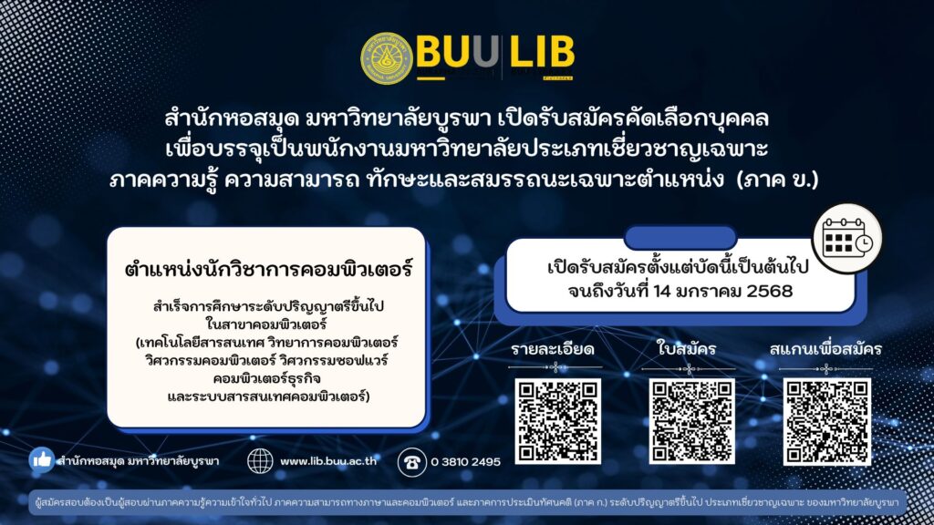 รับสมัครคัดลือกบุคคลเพื่อบรรจุเป็นพนักงานมหาวิทยาลัยประเภทเชี่ยวชาญเฉพาะภาคความรู้ ความสามารถ ทักษะและสมรรถนะเฉพาะตําแหน่ง (ภาค ข.) ตําแหน่งนักวิชาการคอมพิวเตอร์