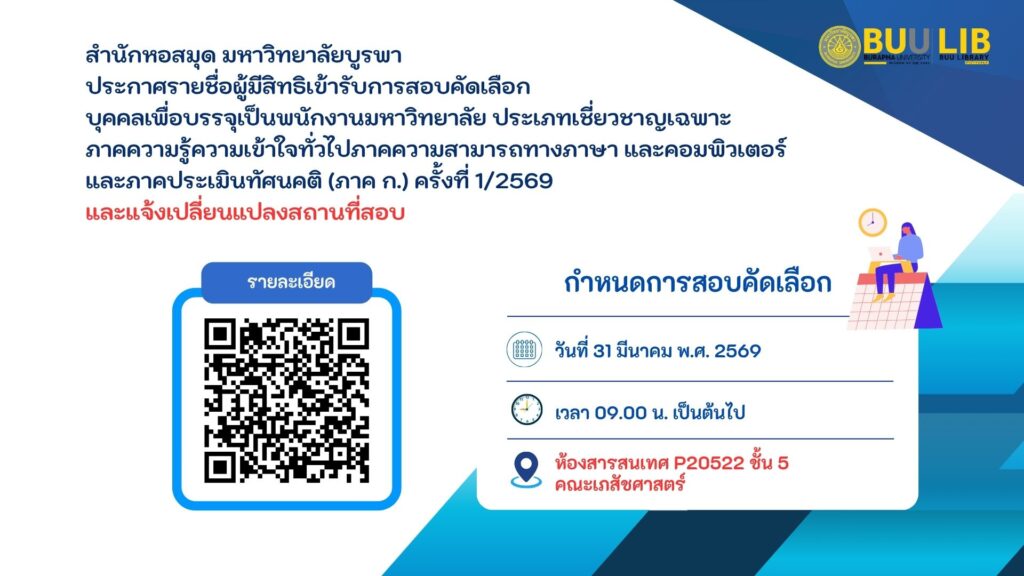 กำหนดการสอบ วันอังคารที่ 31 มีนาคม พ.ศ. 2569 เวลา 09.00 – 12.00 น. และขอแจ้งเปลี่ยนแปลงสถานที่สอบ จาก ห้อง Cyber Zone I ชั้น 6 สำนักหอสมุด เป็น ห้องสารสนเทศ P20522 ชั้น 5 คณะเภสัชศาสตร์