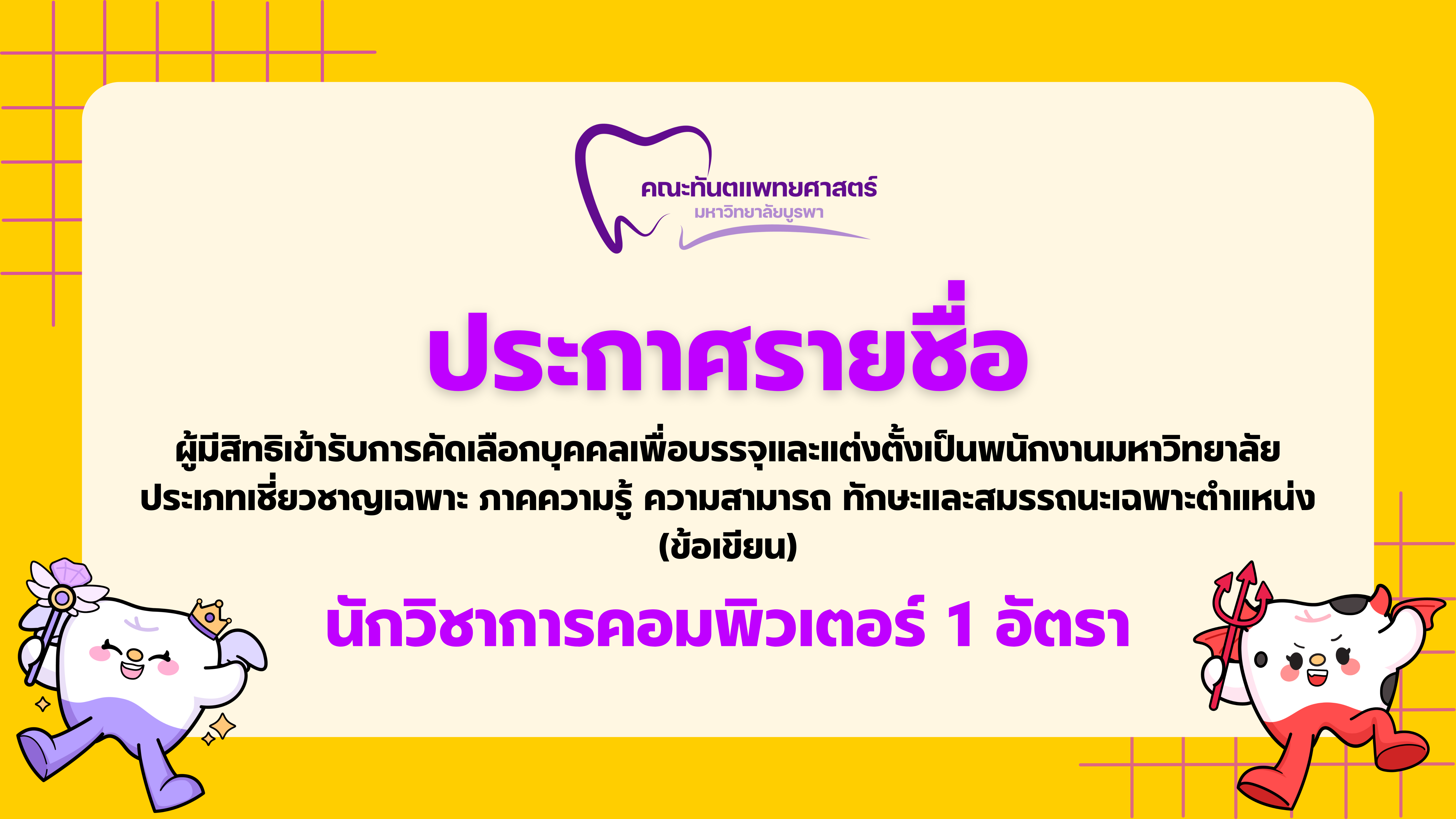 คณะทันตแพทยศาสตร์ มหาวิทยาลัยบูรพา ประกาศรายชื่อผู้มีสิทธิ์เข้ารับการคัดเลือกบุคคลเพื่อบรรจุและแต่งตั้งเป็นพนักงานมหาวิทยาลัย ประเภทเชี่ยวชาญเฉพาะ ภาคความรู้ ความสามารถ ทักษะและสมรรถนะเฉพาะตำแหน่ง (ข้อเขียน) นักวิชาการคอมพิวเตอร์ 1 อัตรา