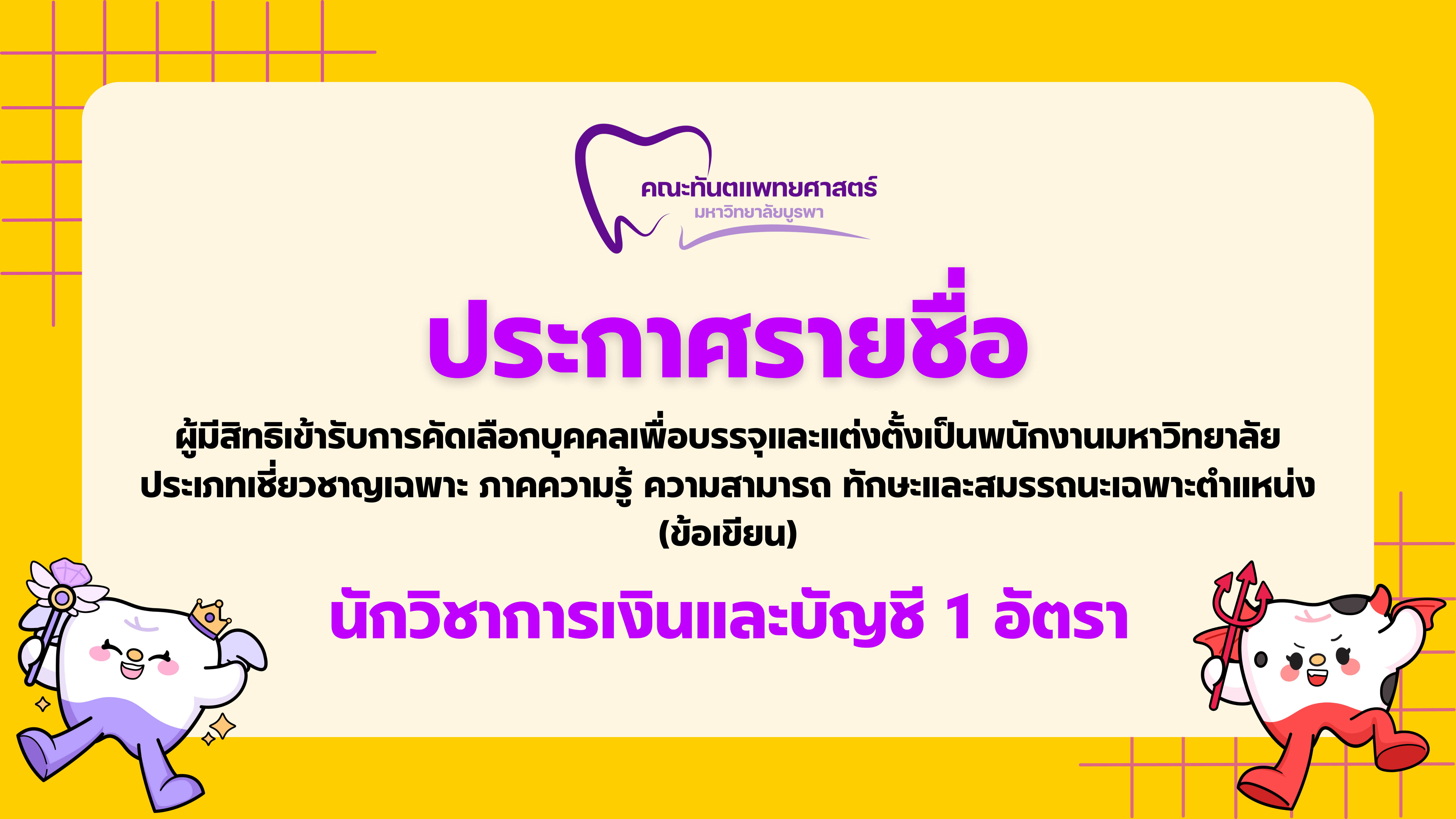 คณะทันตแพทยศาสตร์ มหาวิทยาลัยบูรพา ประกาศรายชื่อผู้มีสิทธิ์เข้ารับการคัดเลือกบุคคลเพื่อบรรจุและแต่งตั้งเป็นพนักงานมหาวิทยาลัย ประเภทเชี่ยวชาญเฉพาะ ภาคความรู้ ความสามารถ ทักษะและสมรรถนะเฉพาะตำแหน่ง (ข้อเขียน) นักวิชาการเงินและบัญชี 1 อัตรา