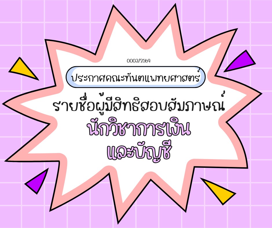 ประกาศรายชื่อผู้มีสิทธิ์เข้ารับการสัมภาษณ์ ตำแหน่งนักวิชาการเงินและบัญชี 1 อัตรา คณะทันตแพทยศาสตร์