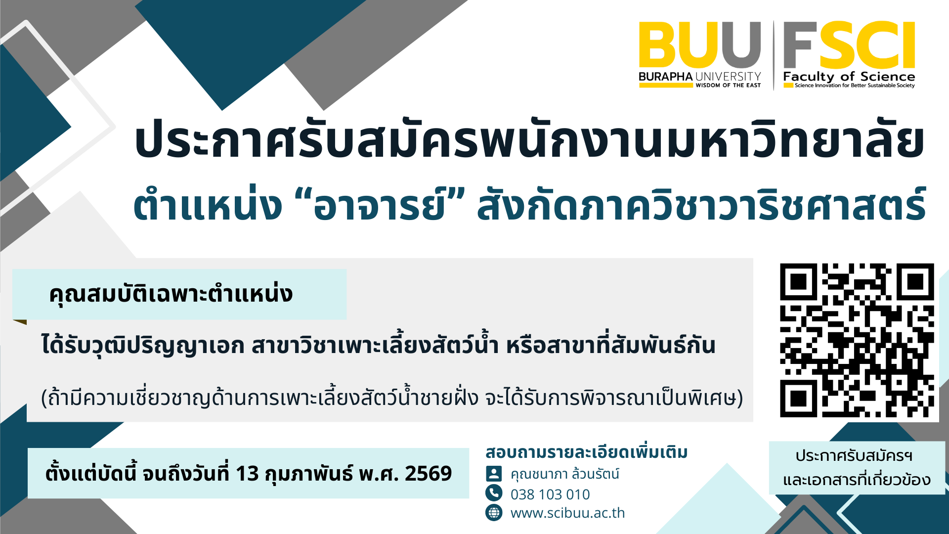 คณะวิทยาศาสตร์ มหาวิทยาลัยบูรพา รับสมัครบุคคลเพื่อบรรจุเป็นพนักงานมหาวิทยาลัย ตำแหน่งอาจารย์ วุฒิป.เอก สาขาวิชาเพาะเลี้ยงสัตว์น้ำ หรือสาขาที่สัมพันธ์กัน สังกัดภาควิชาวาริชศาสตร์