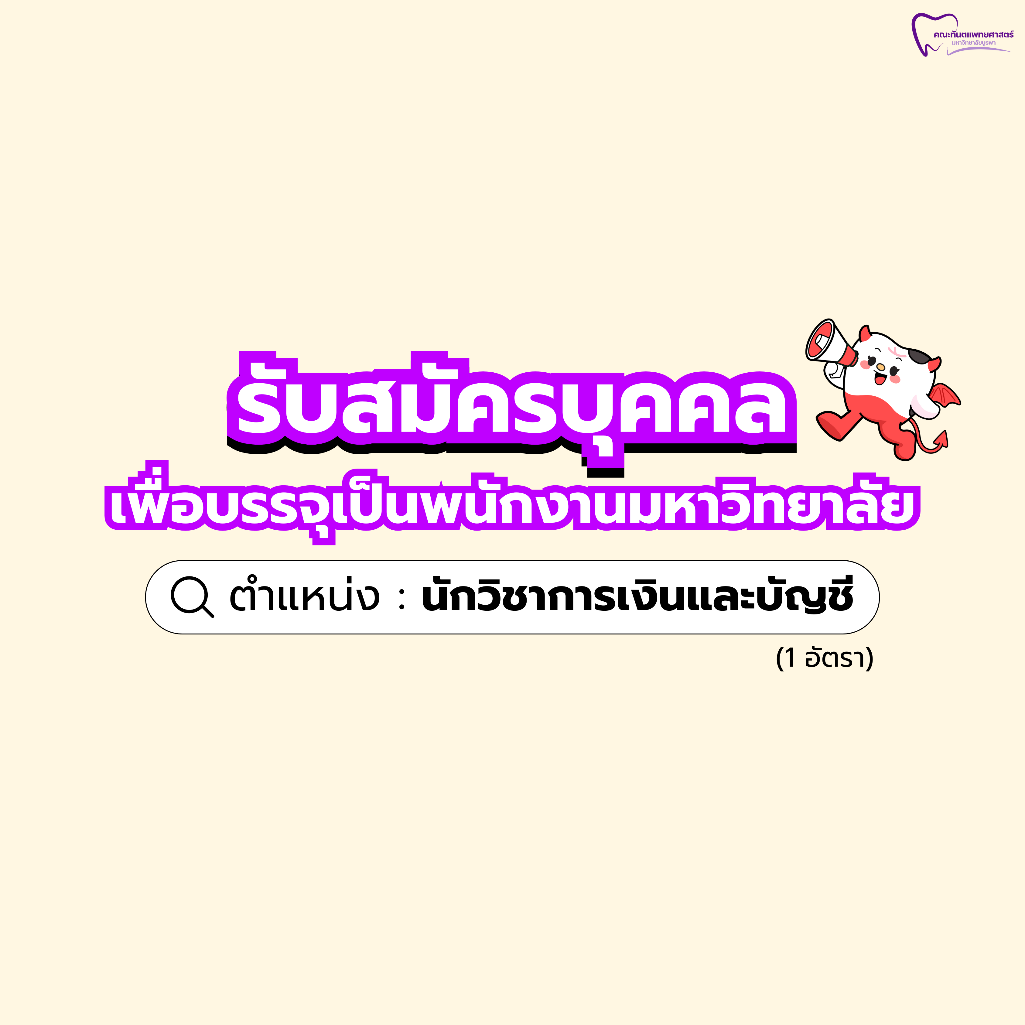 คณะทันตแพทยศาสตร์ มหาวิทยาลัยบูรพา รับสมัครคัดเลือกบุคคลเพื่อบรรจุและแต่งตั้งเป็นพนักงานมหาวิทยาลัย ตำแหน่ง นักวิชาการเงินและบัญชี