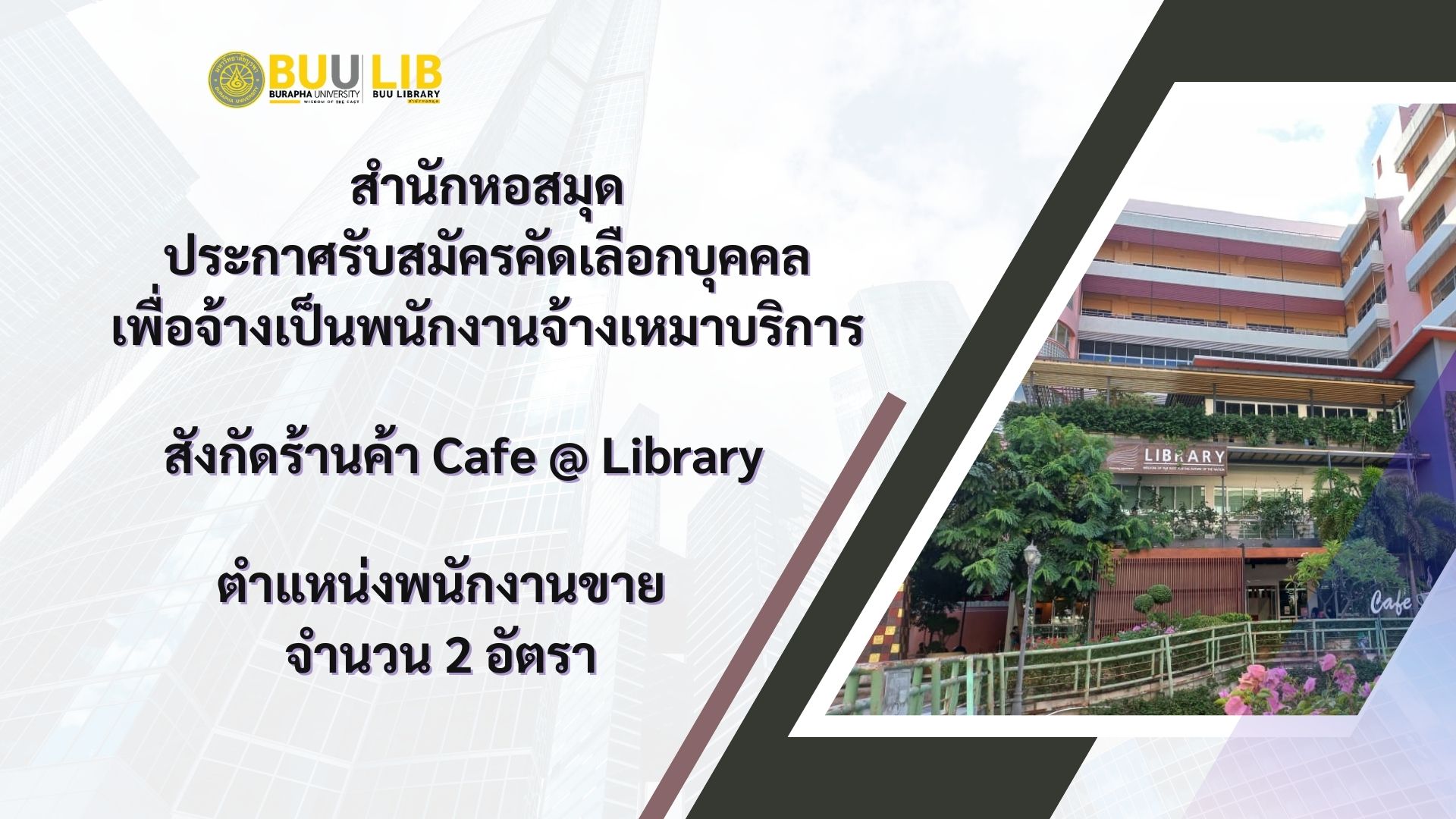 สำนักหอสมุด รับสมัครพนักงานจ้างเหมาบริการ สังกัดร้านค้า Cafe@Library ตำแหน่งพนักงานขาย จำนวน 2 อัตรา