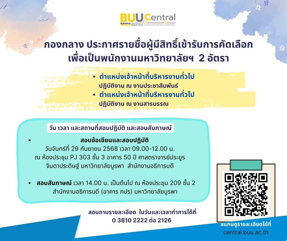 กองกลาง ประกาศรายชื่อผู้มีสิทธิ์เข้ารับการคัดเลือกเพื่อบรรจุเป็นพนักงานมหาวิทยาลัย ประเภทเชี่ยวชาญเฉพาะภาคความรู้ ความสามารถ ทักษะและสมรรถนะเฉพาะตำแหน่ง (ภาค ข.) ครั้งที่ 2/2568