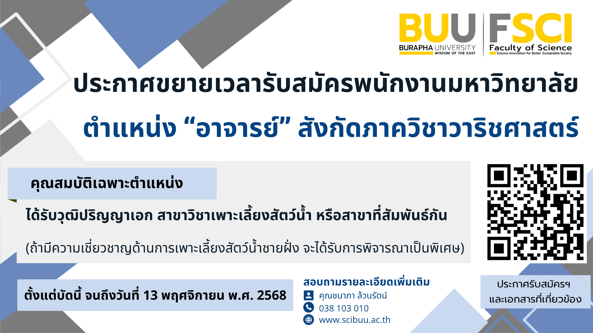 คณะวิทยาศาสตร์ มหาวิทยาลัยบูรพา ขยายเวลารับสมัครบุคคลเพื่อบรรจุเป็นพนักงานมหาวิทยาลัย ตำแหน่งอาจารย์ วุฒิป.เอก สาขาวิชาเพาะเลี้ยงสัตว์น้ำ หรือสาขาที่สัมพันธ์กัน สังกัดภาควิชาวาริชศาสตร์