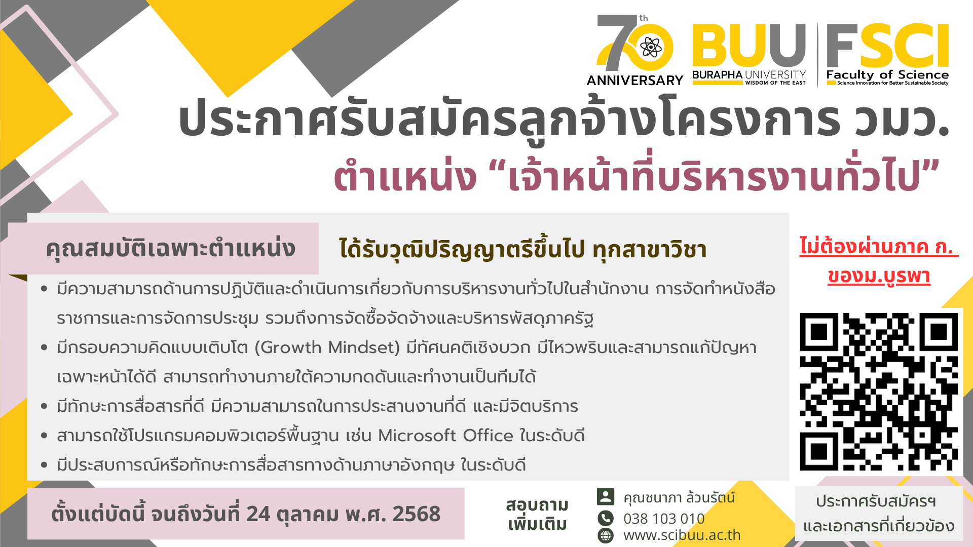 คณะวิทยาศาสตร์ มหาวิทยาลัยบูรพา รับสมัครคัดเลือกบุคคลเป็นลูกจ้างโครงการ ตำแหน่งเจ้าหน้าที่บริหารงานทั่วไป สังกัดโครงการห้องเรียนวิทยาศาสตร์ในโรงเรียน โดยการกำกับดูแลของมหาวิทยาลัย (โครงการ วมว.) มหาวิทยาลัยบูรพา