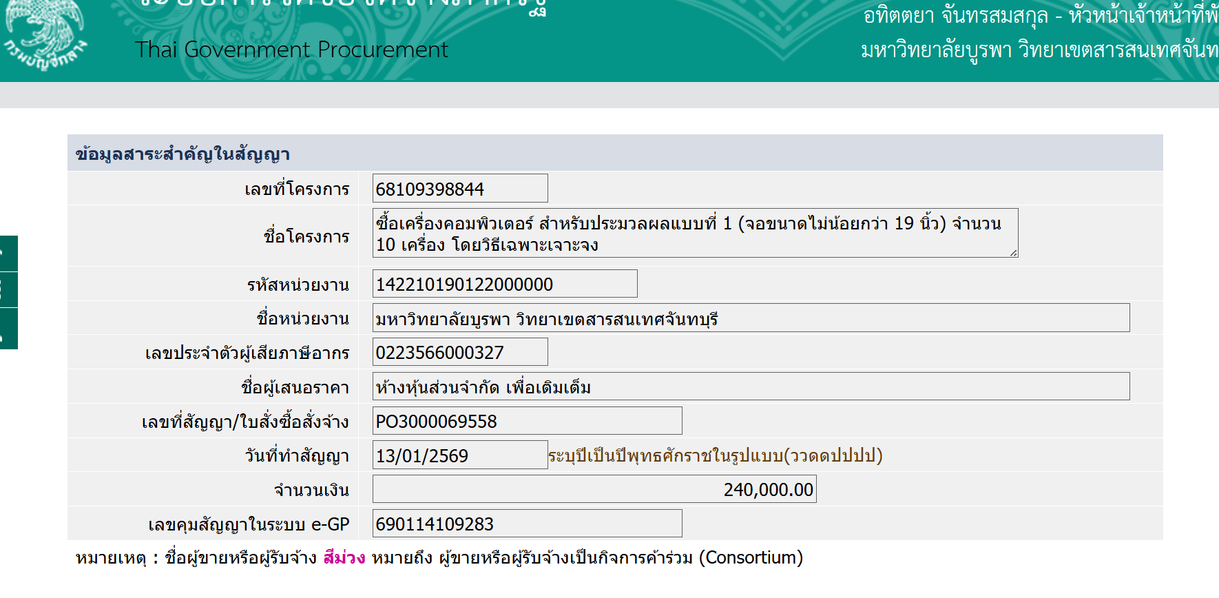 ประกาศข้อมูลสาระสำคัญในซื้อเครื่องคอมพิวเตอร์ สำหรับประมวลผลแบบที่ 1 (จอขนาดไม่น้อยกว่า 19 นิ้ว) จำนวน 10 เครื่อง โดยวิธีเฉพาะเจาะจง