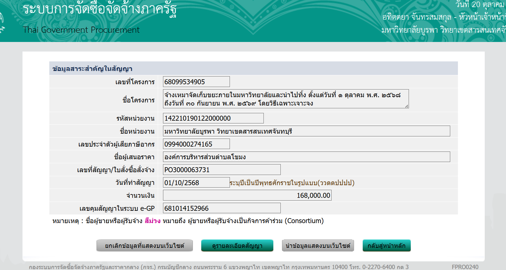 จ้างเหมาจัดเก็บขยะภายในมหาวิทยาลัยและนำไปทิ้ง ตั้งแต่วันที่ ๑ ตุลาคม พ.ศ. ๒๕๖๘ ถึงวันที่ ๓๐ กันยายน พ.ศ. ๒๕๖๙ โดยวิธีเฉพาะเจาะจง