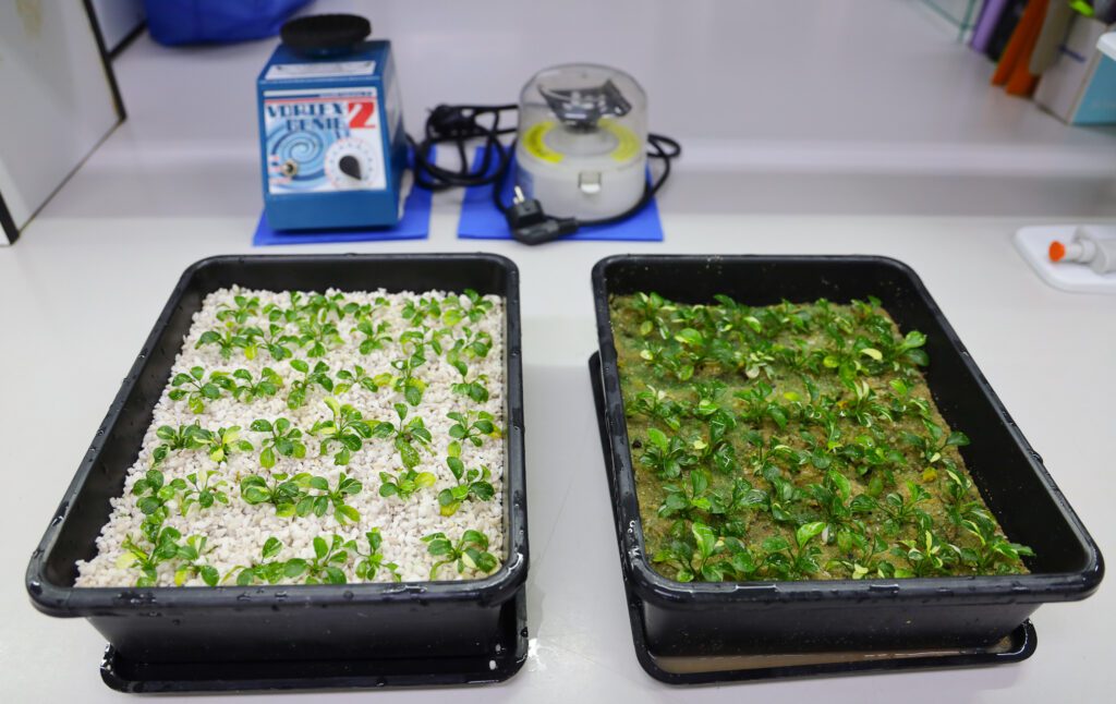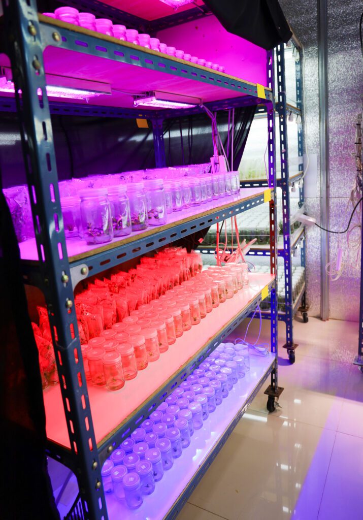 ซึ่งอาจารย์และนักวิจัยของคณะ ฯ เรามีความเชี่ยวชาญด้านการเพาะเลี้ยงเนื้อเยื่อพืชเศรษฐกิจอยู่แล้ว จึงใช้เทคนิคนี้ศึกษาการใช้แสงสีต่าง ๆ ที่จะมีผลส่งเสริมการเจริญเติบโตไม้น้ำ เนื่องจากแสงเป็นหนึ่งในปัจจัยที่กระตุ้นการสังเคราะห์แสง และการพัฒนาของพืชในสภาพปลอดเชื้อ ความยาวคลื่นของแสงแต่ละสีมีผลกระทบต่อเนื้อเยื่อพืชที่แตกต่างกัน ซึ่งถ้าสามารถหาชนิดของแสงที่เหมาะสมต่อการเจริญเติบโตของไม้น้ำชนิดนี้ได้ ก็จะทำให้การขยายพันธุ์ไม้น้ำชนิดนี้ด้วยเทคนิคการเพาะเลี้ยงเนื้อเยื่อประสบความสำเร็จ สามารถเพิ่มจำนวนต้นได้มากกว่าการขยายพันธุ์ตามธรรมชาติ ดังนั้นเราจึงใช้เทคนิคการเพาะเลี้ยงเนื้อเยื่อซึ่งใช้เวลาสั้นแต่สามารถขยายพันธุ์ได้จํานวนมาก และใช้พื้นที่ไม่มากมีพื้นที่จำกัดก็สามารถเพาะเลี้ยงได้ โดยไม่จําเป็นต้องใช้มีฟาร์มขนาดใหญ่ก็ทำได้