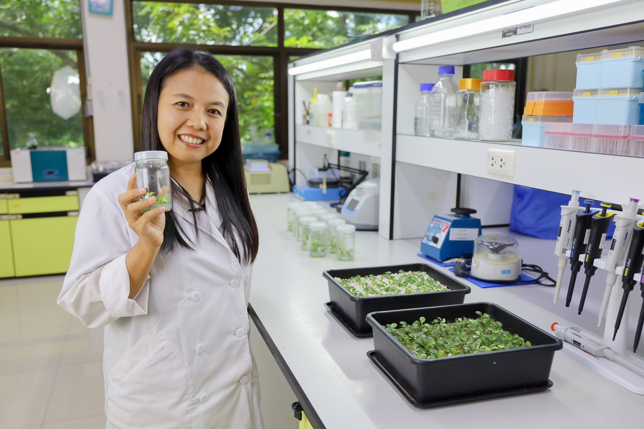 ก็ยังมีพืชเศรษฐกิจอื่น ๆ ไม่ว่าจะอ้อย มะพร้าว ปาล์มน้ำมัน นอกจากนี้เรายังสอนการขยายพันธุ์ เพราะว่าอย่างที่ทราบกันดีว่าพืชสมุนไพรปัจจุบันนี้สมุนไพรที่ขยายพันธุ์ตามธรรมชาติเราไม่สามารถควบคุมปริมาณสารสําคัญได้ ทีนี้ถ้าน้อง ๆ อยากจะเปิดบริษัทในอนาคต อยากจะผลิตพืชสมุนไพรให้ได้ปริมาณสารที่คงที่ เทคนิคการเพาะเลี้ยงเนื้อเยื่อเป็นเทคนิคหนึ่งที่จะใช้ในการแก้ปัญหาให้ได้ปริมาณสารสําคัญที่คงที่ได้ รับรองว่าเรียนจบออกไป ทำได้ ทำเป็นทุกคนค่ะ