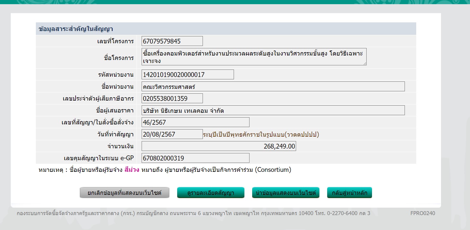 ประกาศข้อมูลสาระสำคัญในสัญญาซื้อเครื่องคอมพิวเตอร์สำหรับงานประมวลผลระดับสูงในงานวิศวกรรมขั้นสูง