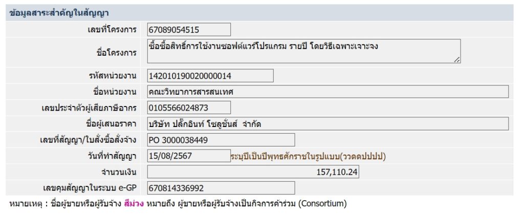 ประกาศข้อมูลสาระสำคัญในสัญญา ซื้อสิทธ์การใช้งานซอฟต์แวร์โปรแกรม รายปี โดยวิธีเฉพาะเจาะจง (คณะวิทยาการสารสนเทศ)