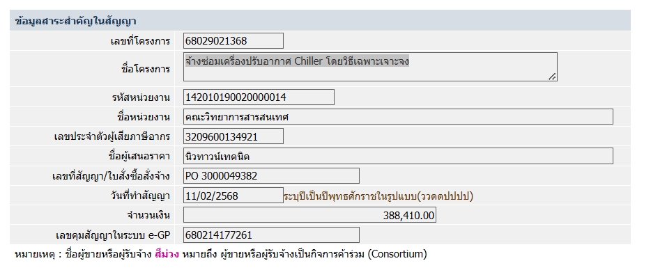 ประกาศข้อมูลสาระสำคัญในสัญญา งานจ้างซ่อมเครื่องปรับอากาศ Chiller โดยวิธีเฉพาะเจาะจง