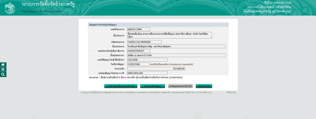 ประกาศข้อมูลสาระสำคัญในสัญญา งานซื้อหนังสือเรียนฝ่ายการศึกษานานาชาติขั้นพื้นฐาน ประจำปีการศึกษา 2568