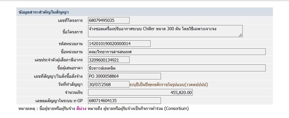 ประกาศข้อมูลสาระสำคัญในสัญญา จ้างซ่อมเครื่องปรับอากาศระบบ Chiller ขนาด 300 ตัน โดยวิธีเฉพาะเจาะจง