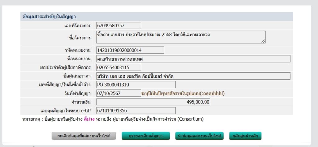 ประกาศข้อมูลสาระสำคัญในสัญญา ซื้อถ่ายเอกสาร ประจำปีงบประมาณ 2568 โดยวิธีเฉพาะเจาะจง