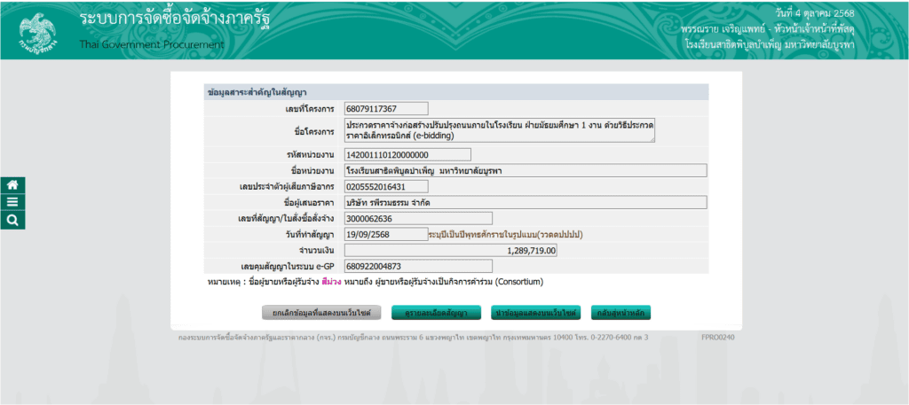 ประกาศข้อมูลสาระสำคัญในสัญญา งานจ้างก่อสร้างปรับปรุงถนนภายในโรงเรียนสาธิต ฝ่ายมัธยมศึกษา 1 งาน ด้วยวิธีประกวดราคาอิเล็กทรอนิกส์ (E-bidding)