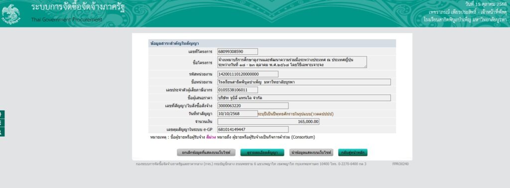 ประกาศข้อมูลสาระสำคัญในสัญญา งานจ้างเหมาบริการศึกษาดูงานโครงการศึกษาดูงานและพัฒนาความร่วมมือระหว่างประเทศ ณ ประเทศญี่ปุ่น  ระหว่างวันที่ 18 – 23 ตุลาคม พ.ศ. 2568 โดยวิธีเฉพาะเจาะจง