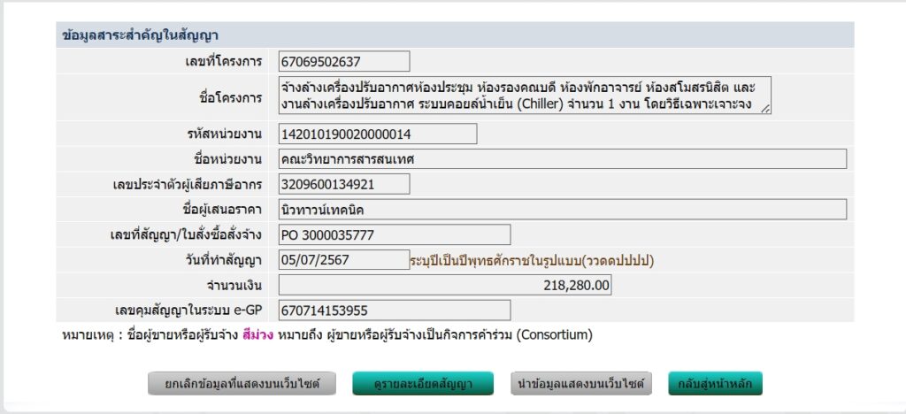 ประกาศข้อมูลสาระสำคัญในสัญญา จ้างล้างเครื่องปรับอากาศห้องประชุม ห้องรองคณบดี ห้องพักอาจารย์ ห้องสโมสรนิสิต และงานล้างเครื่องปรับอากาศ ระบบคอยล์น้ำเย็น (Chiller) จำนวน 1 งาน โดยวิธีเฉพาะเจาะจง (คณะวิทยาการสารสนเทศ)