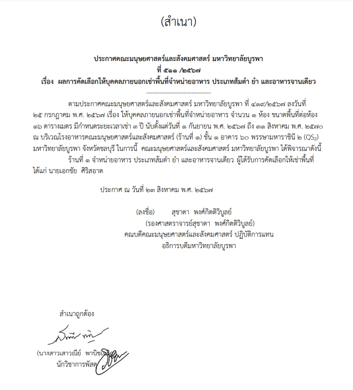 ประกาศผลผู้ชนะการเสนอราคาให้บุคคลภายนอกเช่าพื้นที่จำหน่ายอาหารประเภท ส้มตำ ยำ และอาหารจานเดียว(ร้านที่1)