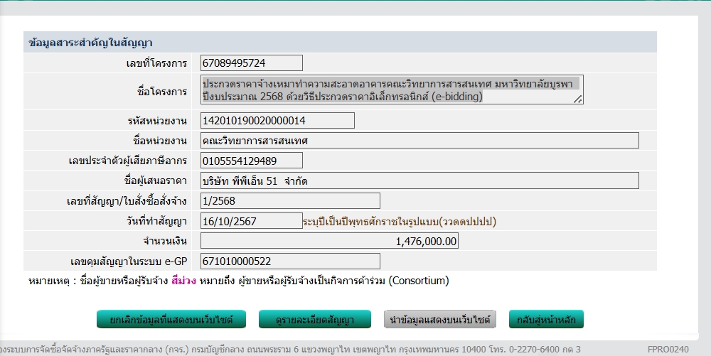 ประกาศสาระสำคัญในสัญญา ประกวดราคาจ้างเหมาทำความสะอาดอาคารคณะวิทยาการสารสนเทศ มหาวิทยาลัยบูรพา ปีงบประมาณ 2568 ด้วยวิธีประกวดราคาอิเล็กทรอนิกส์ (e-bidding)