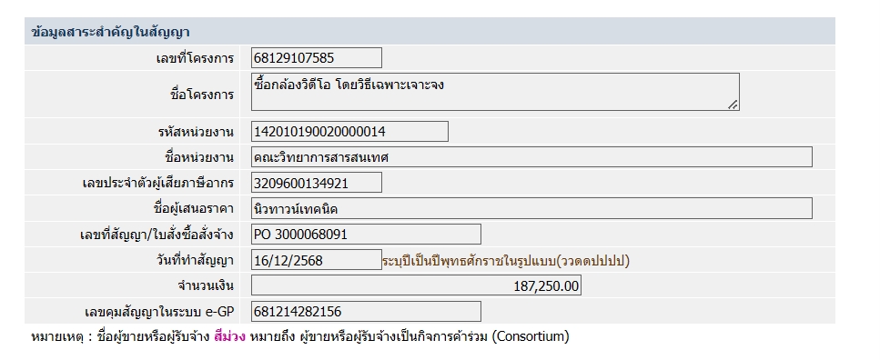 ประกาศสาระสำคัญในสัญญางานซื้อกล้องวิดีโอ จำนวน 1 กล้อง โดยวิธีเฉพาะเจาะจง