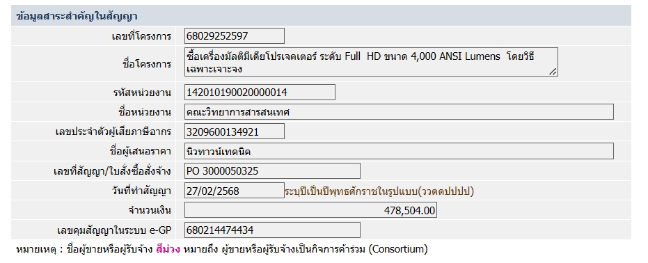 ประกาศสาระสำคัญในสัญญา ซื้อเครื่องมัลติมีเดียโปรเจคเตอร์ ระดับ Full HD ขนาด ๔,๐๐๐ ANSI Lumens จำนวน 13 เครื่อง โดยวิธีเฉพาะเจาะจง