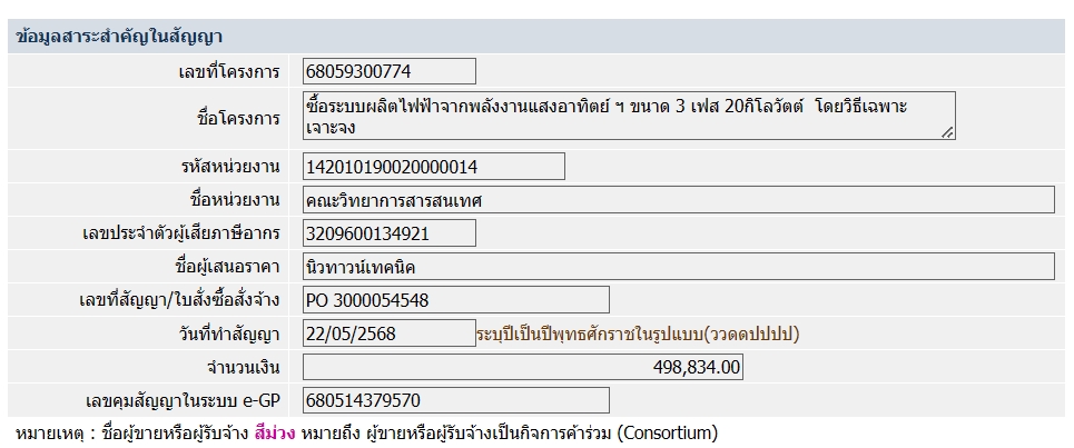ประกาศสาระสำคัญในสัญญา งานซื้อระบบผลิตไฟฟ้าจากพลังงานแสงอาทิตย์ ขนาด 3 เฟส 20 กิโลวัตต์ โดยวิธีเฉพาะเจาะจง