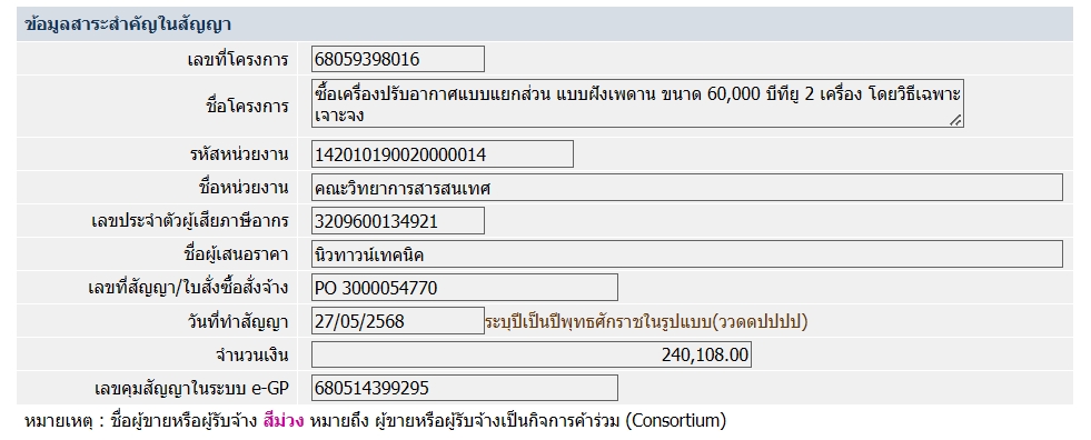 ประกาศสาระสำคัญในสัญญางานซื้อเครื่องปรับอากาศแบบแยกส่วน แบบฝังเพดาน ขนาด 60,000 บีทียู 2 เครื่อง โดยวิธีเฉพาะเจาะจง