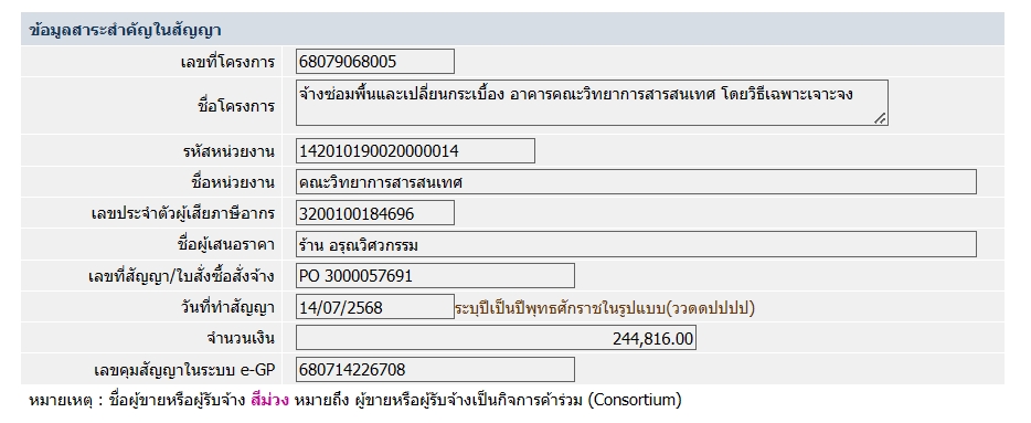 ประกาศสาระสำคัญในสัญญา จ้างซ่อมพื้นและเปลี่ยนกระเบื้อง อาคารคณะวิทยาการสารสนเทศ โดยวิธีเฉพาะเจาะจง