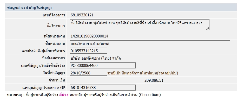 ประกาศสาระสำคัญในสัญญา งานซื้อโต๊ะทำงาน ชุดโต๊ะทำงาน ชุดโต๊ะทำงาน3ที่นั่ง เก้าอี้สำนักงาน โดยวิธีเฉพาะเจาะจง