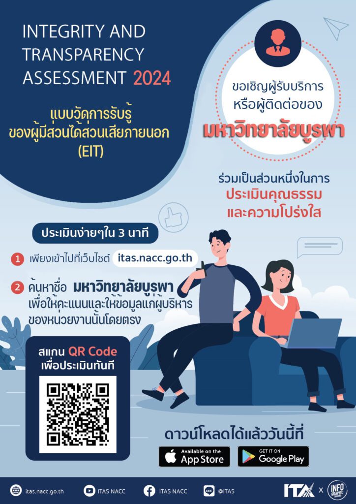 มหาวิทยาลัยบูรพา ขอเชิญผู้รับบริการหรือผู้ติดต่อของมหาวิทยาลัยร่วมเป็นส่วนหนึ่งในการประเมินคุณธรรมและความโปร่งใสทำแบบวัดการรับรู้ของผู้มีส่วนได้ส่วนเสียภายนอก (EIT)