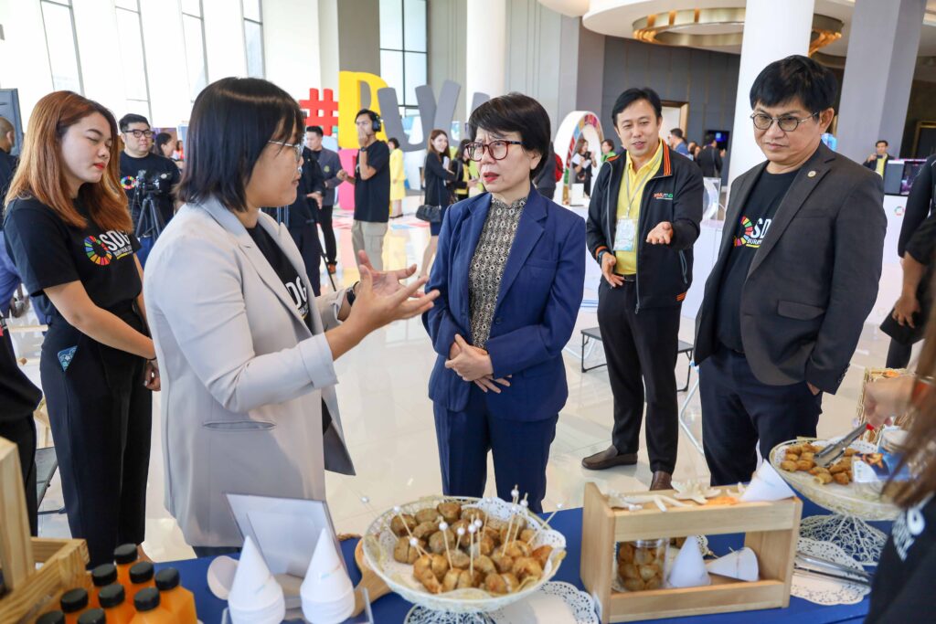 ในโอกาสนี้ ดร.จันทร์เพ็ญ เมฆาอภิรักษ์ ผู้ตรวจราชการ รักษาราชการแทนรองปลัดกระทรวงการอุดมศึกษา วิทยาศาสตร์ วิจัยและนวัตกรรม (อว.) รองศาสตราจารย์ ดร.วัชรินทร์ กาสลัก อธิการบดีมหาวิทยาลัยบูรพา และผู้ช่วยศาสตราจารย์ ดร.กฤษชัย ศรีบุญมา ประธานเครือข่ายมหาวิทยาลัยยั่งยืนแห่งประเทศไทย ได้ร่วมแถลงข่าวกับสื่อมวลชนเกี่ยวกับ นโยบาย ทิศทาง และการขับเคลื่อนด้านการพัฒนาที่ยั่งยืนของกระทรวงการอุดมศึกษา วิทยาศาสตร์ วิจัยและนวัตกรรม (อว.) ในการจัดประชุมฯ ครั้งนี้ เป็นเวทีสำคัญสำหรับการกำหนดแนวนโยบายเพื่อการพัฒนามหาวิทยาลัยตามแนวทางการพัฒนาอย่างยั่งยืน การแลกเปลี่ยน เรียนรู้ประสบการณ์การดำเนินงานเพื่อการพัฒนาอย่างยั่งยืน รวมถึงการกำหนดมาตรฐานการชี้วัดความเป็นมหาวิทยาลัยยั่งยืน อันจะเป็นส่วนสำคัญของการยกระดับมหาวิทยาลัยภายในประเทศ และการสร้างความร่วมมือของสถาบันอุดมศึกษาภายในประเทศ ที่สอดคล้องเชื่อมโยงต่อบริบทการพัฒนาอย่างยั่งยืนในระดับนานาชาติ นำสู่การเป็นต้นแบบสำคัญของภาคส่วนภายในสังคมของประเทศที่สามารถใช้เป็นต้นแบบเพื่อการขยายผลการดำเนินงานสู่ภาคส่วนอื่นได้ต่อไปในอนาคต