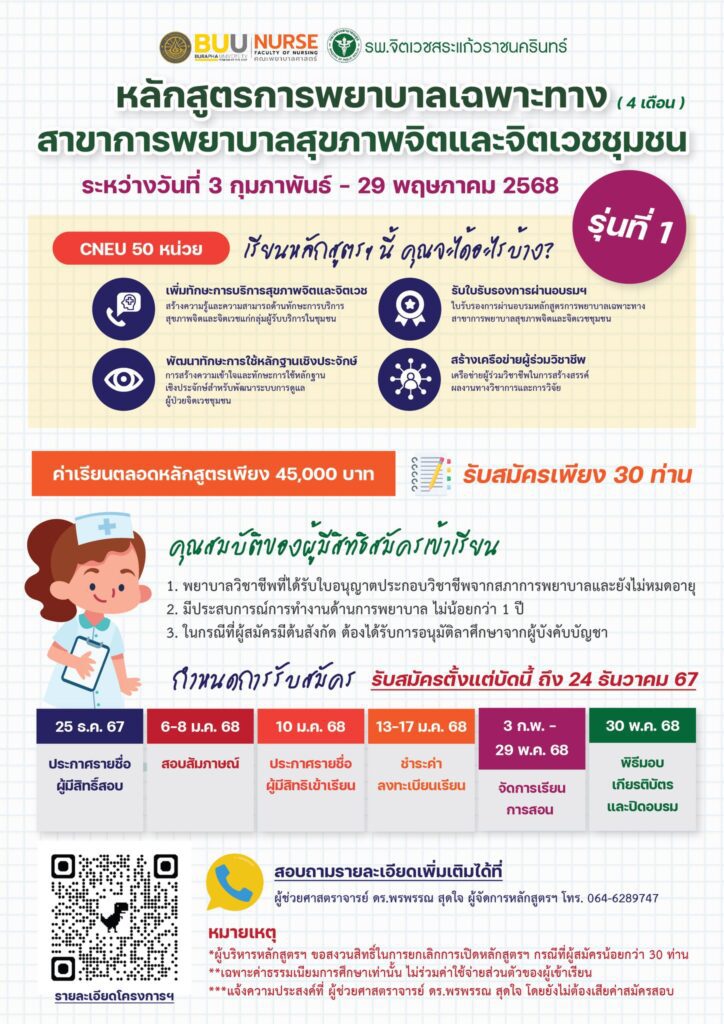 หลักสูตรการพยาบาลเฉพาะทาง สาขาการพยาบาลสุขภาพจิตและจิตเวชชุมชน (4 เดือน) รุ่นที่ 1