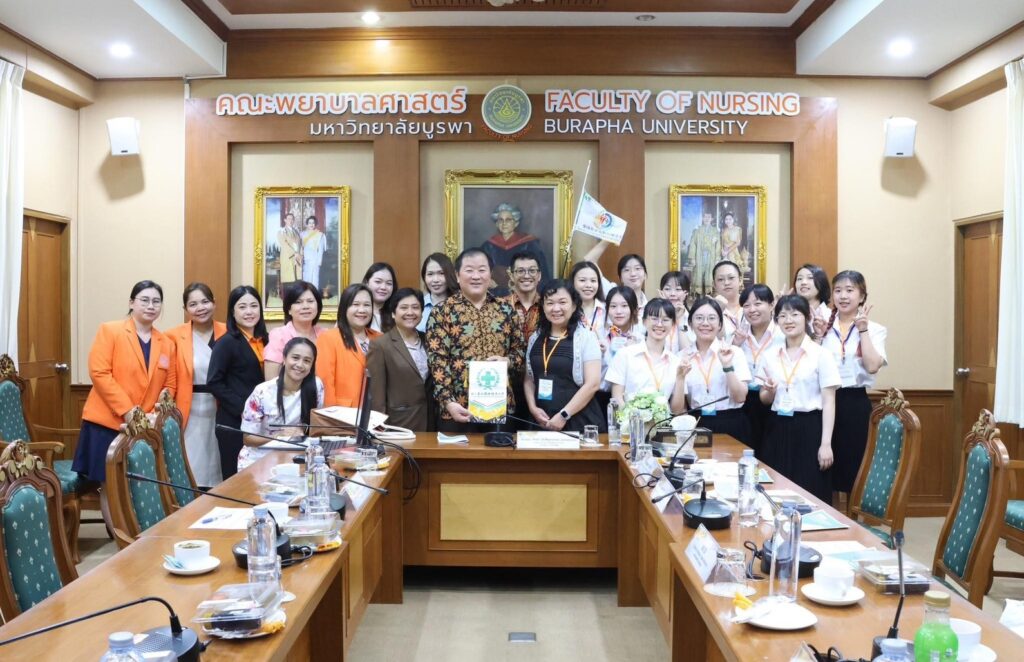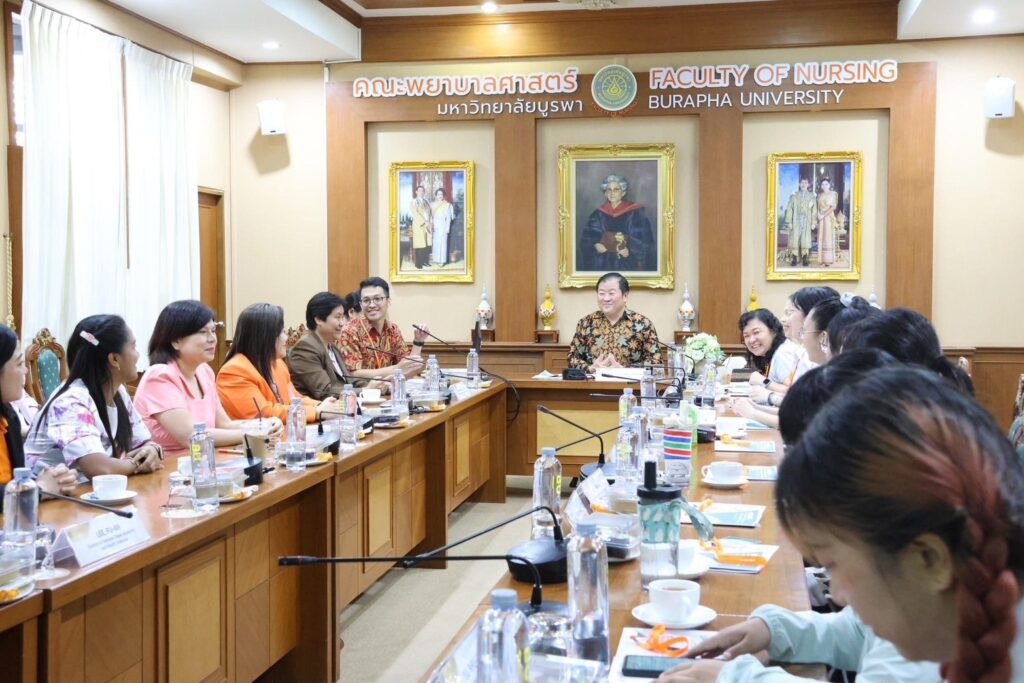 คณะพยาบาลศาสตร์ มหาวิทยาลัยบูรพา โดยรองศาสตราจารย์ ดร.พรชัย จูลเมตต์ คณบดีคณะพยาบาลศาสตร์ ผู้ช่วยศาสตราจารย์ ดร.สายฝน ม่วงคุ้ม รองคณบดีฝ่ายยุทธศาสตร์การต่างประเทศและบัณฑิตศึกษา พร้อมคณาจารย์ คณะพยาบาลศาสตร์ ร่วมต้อนรับ Dr. CHENG, SU-FEN Professor Department of Allied Health Education and Digital Learning และคณะนิสิต จาก National Taipei University of Nursing and Health Sciences สาธารณรัฐจีน จำนวน 12 คน ณ ห้องประชุมนพรัตน์ ชั้น 6 อาคารนพรัตน์ฯ คณะพยาบาลศาสตร์