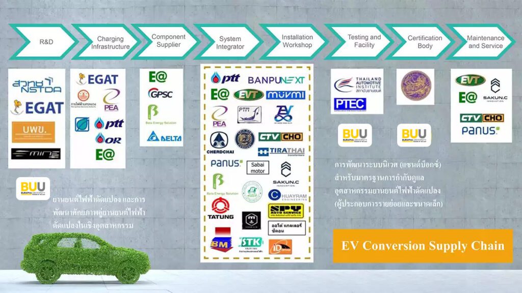ศูนย์เชี่ยวชาญ EV conversion (EVcon) ตั้งอยู่ที่ภาควิชาวิศวกรรมไฟฟ้า คณะวิศวกรรมศาสตร์ มหาวิทยาลัยบูรพา เกิดขึ้นภายใต้ความร่วมมือระหว่างภาควิชาวิศวกรรมไฟฟ้า กับ กระทรวงการอุดมศึกษา วิทยาศาสตร์ วิจัยและนวัตกรรม และ EEC HDC โดยประสานกับกลุ่มอุตสาหกรรมเอกชนที่สนใจด้านรถยนต์ไฟฟ้าดัดแปลงฯ ปัจจุบันเดินหน้าสร้างความร่วมมือในการพัฒนาบุคลากรด้าน EV และ EV conversion ในสองส่วน คือ ส่วนของการผลิตสร้างดัดแปลงรถยนต์ กับ ส่วนของการจัดทำมาตรฐาน EV conversion ที่มีการประสานความร่วมมือกับ กระทรวงอุดมศึกษา กรมการขนส่งทางบก เครือข่าย 11 วิทยาลัยอาชีวศึกษา และเครือข่ายอู่รถยนต์ในท้องถิ่น โดยการสนับสนุนของ EEC HDC เพื่อขับเคลื่อนสร้างอุตสาหกรรมใหม่ ที่มีเป้าหมายปลายทางสร้างสรรค์ครบทุกมิติ ทั้งการสร้างโอกาสใหม่ให้กลุ่มอู่รถยนต์ให้เข้าสู่โอกาสใหม่ทางเศรษฐกิจ และช่วยขับเคลื่อนประเทศเข้าสู่เศรษฐกิจแบบนำกลับมาใช้ใหม่เศรษฐกิจสีเขียว ที่เรียกกันว่า BCG ซึ่งจะช่วยลดหนี้ครัวเรือนให้กับผู้คนที่ทำมาหากินในสาขาโลจิสติกส์ คมนาคมขนส่งขนาดกลางถึงขนาดเล็ก ที่ทุกวันนี้มีรถยนต์กว่า 2 ล้านคัน ใช้งานมาเกินสิบปี-ถึงเวลาจะต้องเปลี่ยนรถใหม่! หากนำรถเก่าไปดัดแปลงเป็นรถไฟฟ้า ก็จะลดค่าใช้จ่ายด้านเชื้อเพลิงลงกิโลเมตรละมากกว่าหนึ่งบาท กับทั้งจะทำให้รัฐบาลได้รับประโยชน์จาก คาร์บอนเครดิต และยังช่วยลดมลภาวะในประเทศลงอย่างมีนัยสำคัญ ปัจจุบันศูนย์นี้ได้ทำงานวิจัยและพัฒนาก้าวหน้าไปมากพร้อมกับได้จัดฝึกอบรมบุคลากร สนับสนุนผู้คนเข้าสู่อุตสาหกรรมใหม่นี้ไปแล้ว 5 รุ่น กว่า 100 คน ซึ่งเป็นการเปิดตัว-เปิดงานการพัฒนาศักยภาพด้าน EV conversion ของไทยให้เกิดอุตสาหกรรมรถยนต์ไฟฟ้าดัดแปลง และกำลังพัฒนาจัดทำแผนงานพัฒนาเครือข่ายอุตสาหกรรมด้านนี้ร่วมกับภาคเอกชน 4 แห่ง ซึ่งเป็นศูนย์ที่มีอนาคตที่ดีและจะสร้างมูลค่าเศรษฐกิจสูงหลายแสนล้าน รวมทั้งสามารถลงลึกถึงกลุ่ม SMEs ได้อย่างดีต่อไป