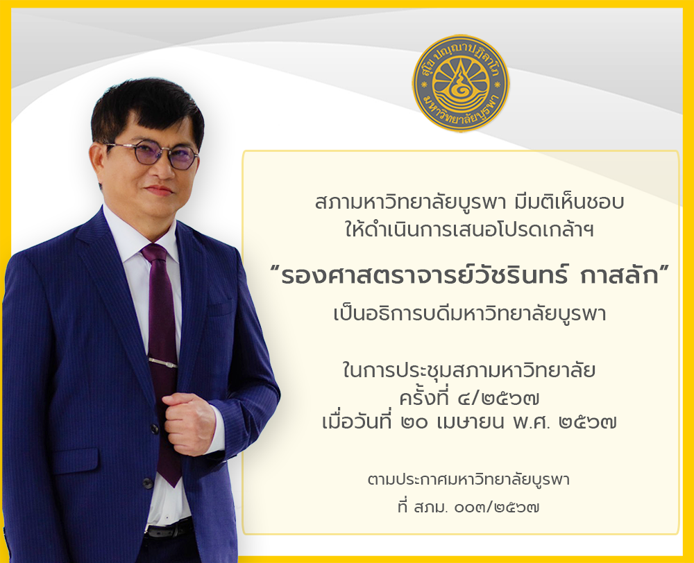 สภามหาวิทยาลัยบูรพา มีมติเห็นชอบให้ดำเนินการเสนอโปรดเกล้าฯ“รองศาสตราจารย์วัชรินทร์ กาสลัก” เป็นอธิการบดีมหาวิทยาลัยบูรพา
